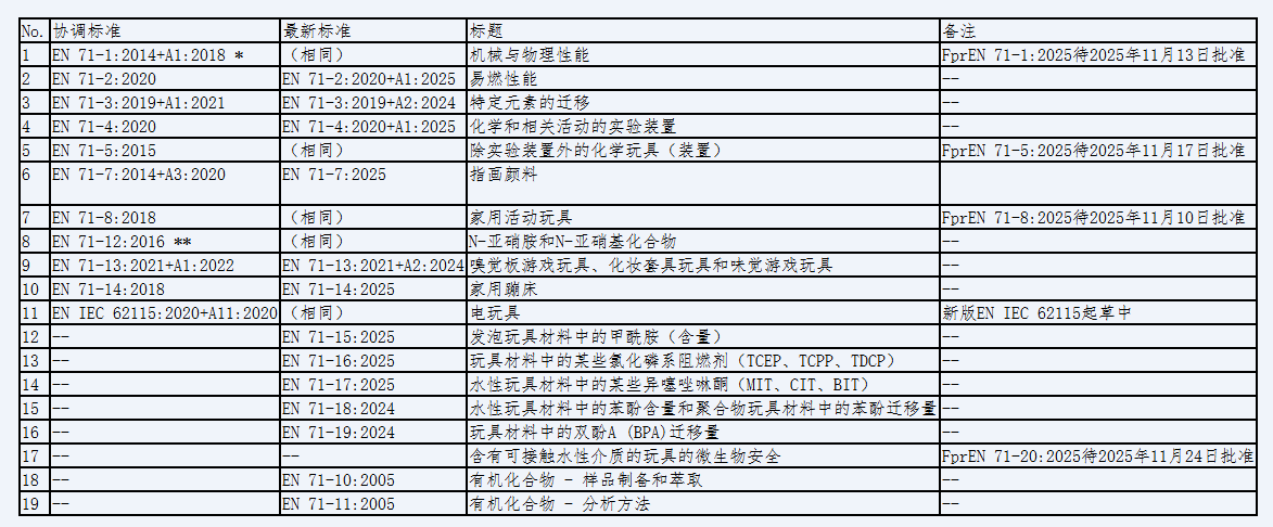 近日,欧盟委员会向欧洲标准化委员会(CEN)和欧洲电工标准化委员会(CENELEC)发送标准化指示M/589 (C(2022)7410),要求其起草新的玩具协调标准,并修订现有的玩具协调标准。目前(2025年10月),CEN已发布11项新玩具标准,另外将预计在2025年11月批准4项新标准。