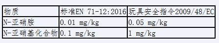 ** EN 71-12:2016中第4.2条表2第a点中的限值(即针对意图供36个月以下儿童使用,且意图或可能放入口中的弹性体玩具的限值)低于玩具安全指令2009/48/EC附件II第III部分第8点中规定的符合的限值: