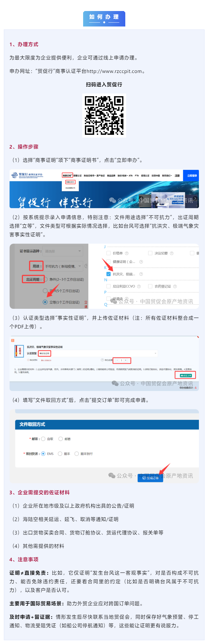 简单说,这是贸促会出具的事实性商事证明,专门用来证明“不可抗力相关事实确实存在”。比如某地暴雨导致工厂停工、政府发布交通管制令等,证明会客观记录这些情况。